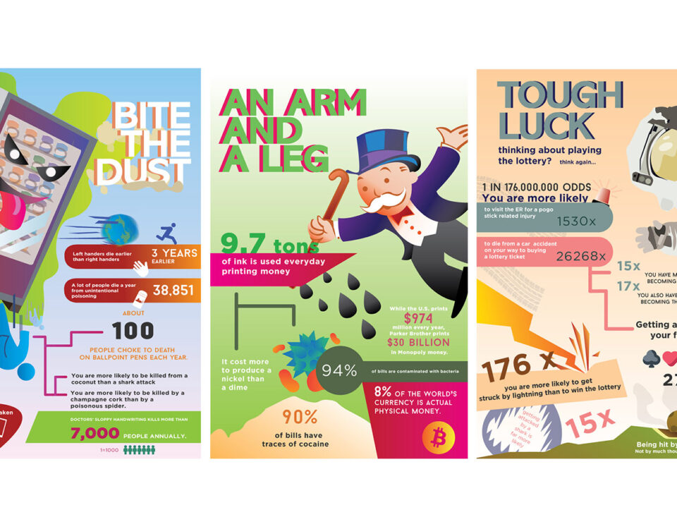 •The first poster is a infographic based on unexpected deaths. •The second poster is a infographic based on facts about money. •The 3rd poster is a infographic based on the probability of winnning the lottery.
