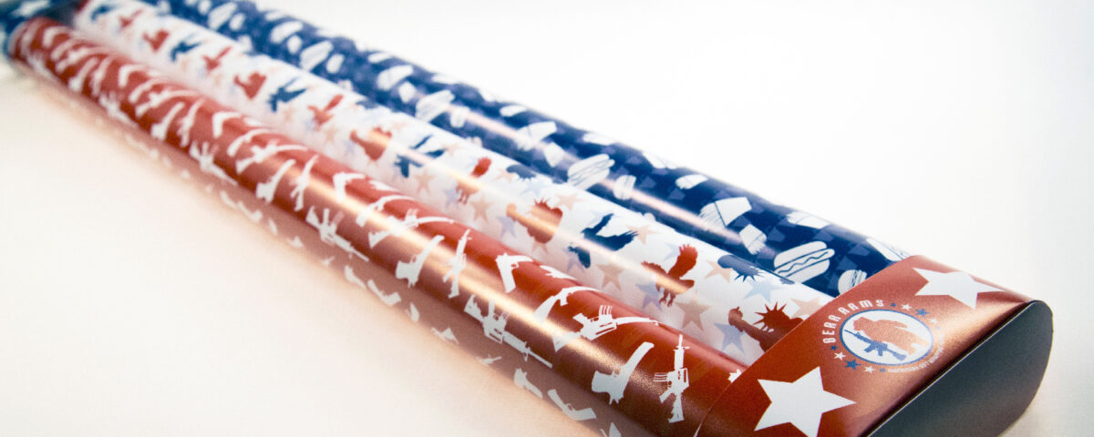 Bear Arms is a wrapping paper company who brands all their wrapping paper with americana themed artwork. A important part of their branding is to embrace the stereotype of the average americana. Using a pun, the logo is designed with a bear literally bearing arms to assault rifle. As well having the iconic red, white, and blue colors. The Bear Arms logo uses the stars of the american flag.
